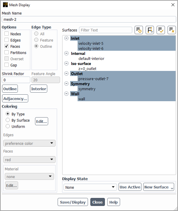 If you are reading a mesh or case file, use the Display Mesh After Reading option to specify whether you want Fluent to automatically display the mesh after the file is read. All of the boundary zones will be displayed, except for the interior zones of 3D geometries. The default status of this option (that is, enabled or disabled) is determined by your decision regarding the Display Mesh After Reading option in Fluent Launcher.