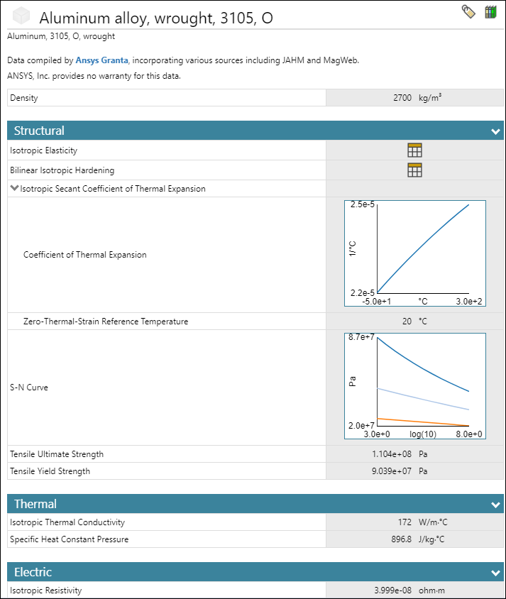 (Optional.) A short description or notes about the material. In the example above, the material description is Aluminum, 3105, O, wrought. Data compiled by Ansys Granta, incorporating various sources including JAHM and MagWeb. ANSYS, Inc. provides no warranty for this data.