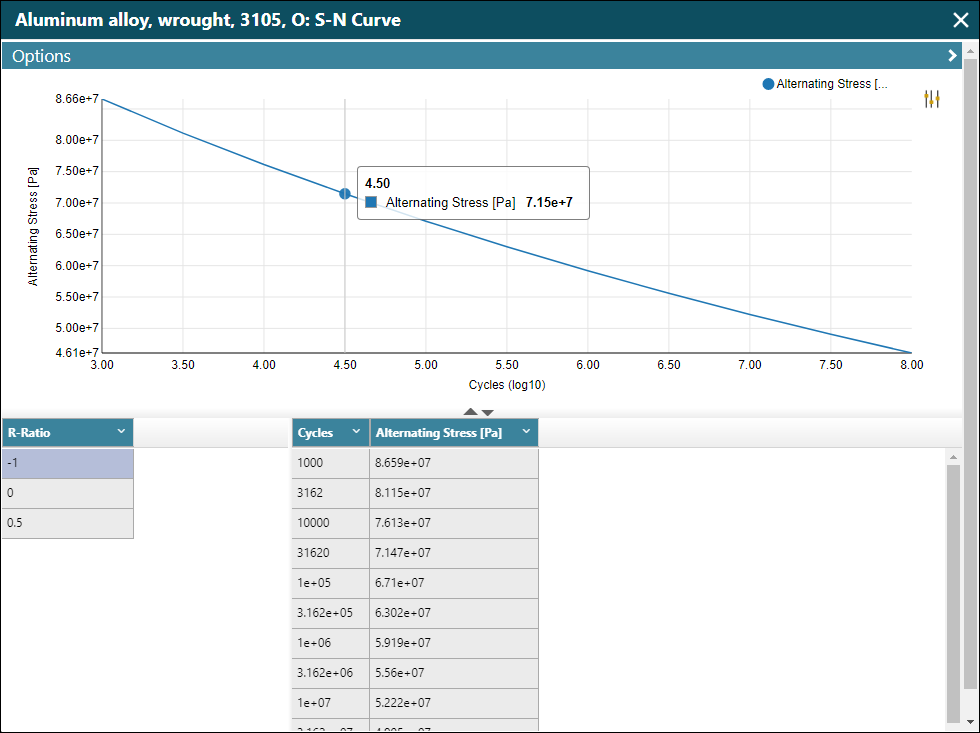 Click a plot to display a larger version of the graph and information such as its associated tabular data. The following example shows a larger version of the Aluminum alloy, wrought, 3105, O: S-N Curve. It includes the R-Ratio and a table of the plotted Cycles and Alternating Stress values.