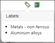 Hover the mouse over the tag icon in the upper right-hand corner of the window to view the labels associated with a material. The labels for Aluminum alloy, wrought, 3105, O are Metals - non-ferrous and Aluminum alloys.