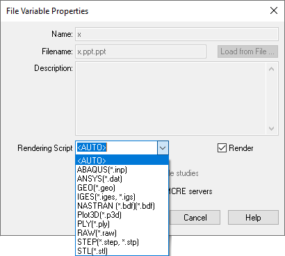 When "<AUTO>" is selected, ModelCenter will use the extension of the file that the File variable is pointing to and will attempt to automatically select the appropriate rendering script. If an appropriate rendering script is not present in the drop-down list, it is possible to create your own custom scripts.