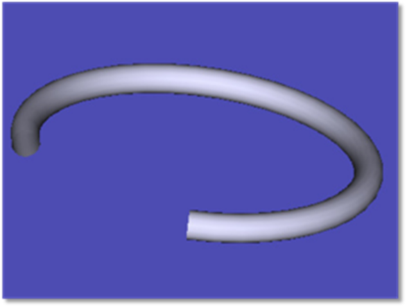 A torus is a circle rotated about a displaced axis. The rotation about the displaced axis may be over a full 360 degrees; or just some subset of that angular range. This object can be used to model optical fibers or curved light pipes. See also the discussion of the Torus Volume for modeling refractive solid torus shapes.