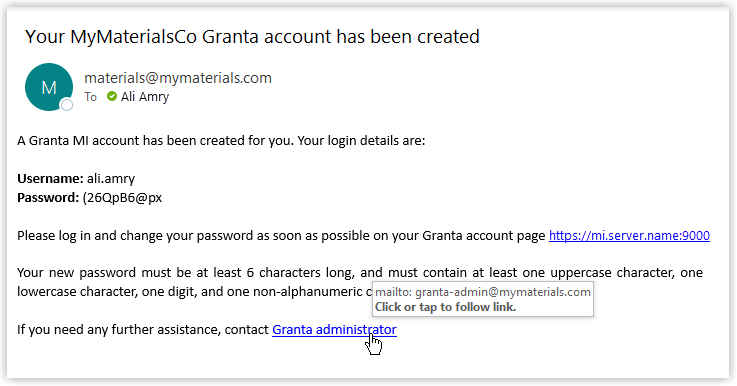 This example shows a new account notification where the Body content will include the user's login credentials, a link to the User Manager application so that they can easily reset their password, some information about password requirements, and an email link to the organization's Granta MI Data Administrator for any additional support.