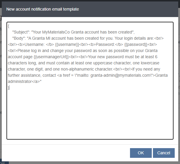 - Edit the New account notification email template field to define the template content for emails sent to new users after their Granta MI user account is created in User Manager.