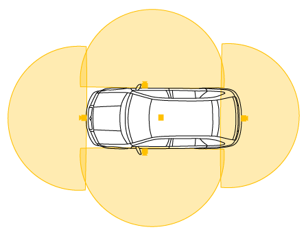 Surround view cameras: a combination of 5 wide-angle (fisheye) cameras providing a 360-degree view around the vehicle.