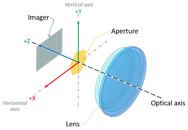 The first stage of the rendering pipeline is a perspective projection. The camera is placed at the vanishing point of the frustum. The point of reference for the position of the camera in AVxcelerate Sensor Labs (see Sensor Referential) is therefore the entrance pupil of the lens system.