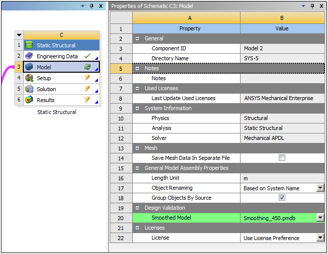 As pointed out above, by default, the application creates an .pmdb file for export. In Workbench, this application generated file becomes available in the drop-down list of the Smoothed Model property of the Model cell properties on the Workbench Project Schematic. The Smoothed Model drop-down menu can contain multiple .pmdb files based on the number of Smoothing objects you specify for export in Mechanical. Multiple files are often created for Topology Density results that have different Retained Threshold settings.