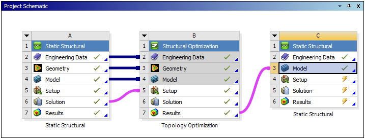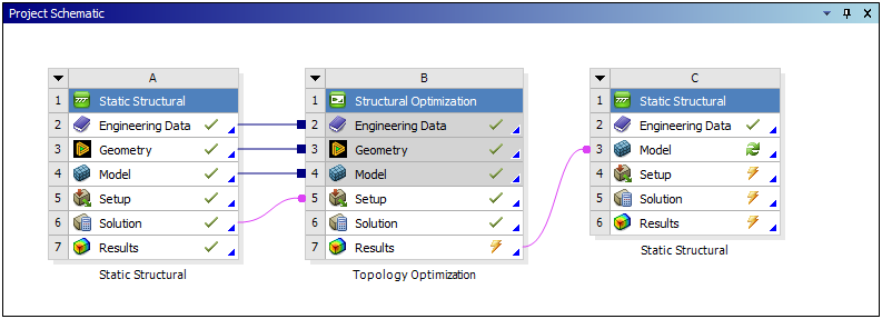 Workbench creates and links a new Mechanical system of the same type that is upstream of the Structural Optimization system.