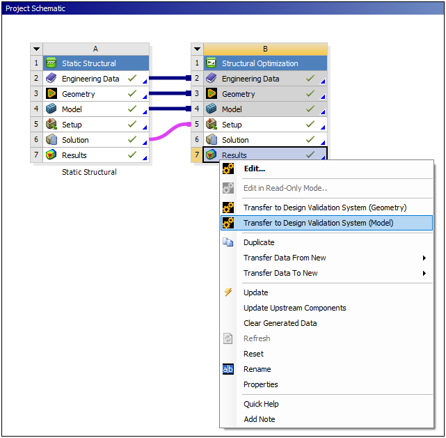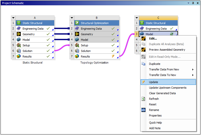 Next, update the Model cell of the new system: right-click and select . This updates the Results cell of the Structural Optimization system (which changed to out-of-date after the new system is created and linked) and the Model cell of the new system.