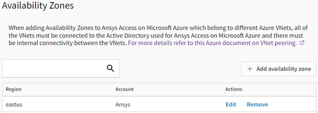 Important: Before adding availability zones in Ansys Access on Microsoft Azure, make sure that your Virtual Networks (VNets) have internal connectivity in Azure. See Ensuring Connectivity Between Virtual Networks (VNets) and Availability Zones.