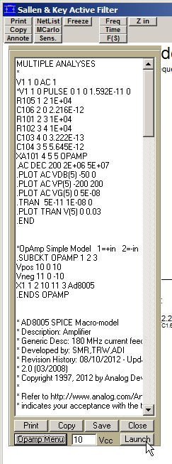 Active filter netlists may be automatically loaded into .CKT simulations applications, such as Microcap. If an application is installed on the user's system that reads .CKT suffix files, a "Launch" button appears below the netlist that will launch the application and import the netlist, as shown in Figure 1. This is useful to validate the Nuhertz simulation results, or to simulate with selected physical opamp Spice models.
