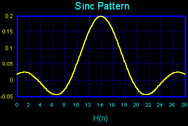 This is a sinc pattern for the 29 tap low pass filter below. It is used in the initial step of creating the FIR filter. The number of taps is the order of the filter plus 1 to account for the 0 term. The value of the taps at the sinc curve is scaled by the window and then is installed directly into the Z transform numerator.
