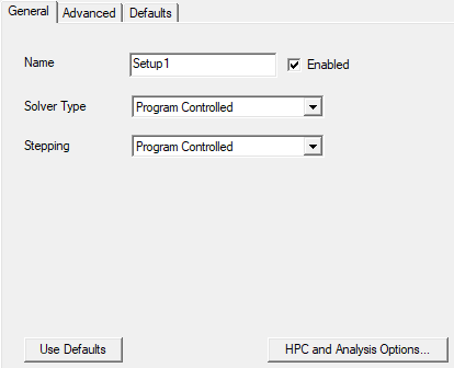 - Name: The default name is Setupx, where x is a numeric value incremented for each solution setup that you add to the design. You can customize the name of each setup as desired.
