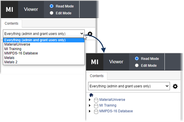 The selected database or Profile determines which Tables, folders, Records, and Subsets are shown in the Contents tree, and also defines the scope of any searches performed in MI Viewer.