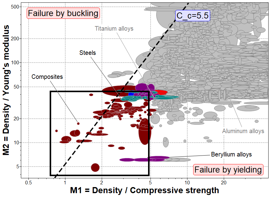 The performance indices for both limiting constraints are plotted on the chart axes. The coupling line represents the point where the failure mode switches from one mode to the other. Materials above the coupling line will fail by buckling and those below will fail by compressive fracture. Materials on the line are equally likely to fail by buckling or yielding.