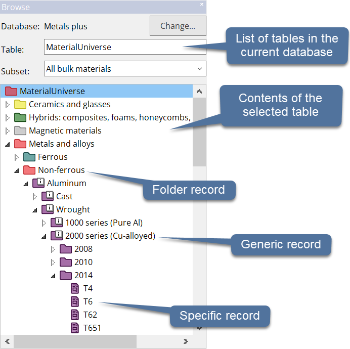 A Table is a compilation of information relevant to a single type of entities (records). For example, it may contain materials and their properties, or manufacturing processes. A Table can be thought of as one page of a spreadsheet: with records (for example, materials) in each row and a set of attributes (sometimes called properties, or 'fields') in the columns.