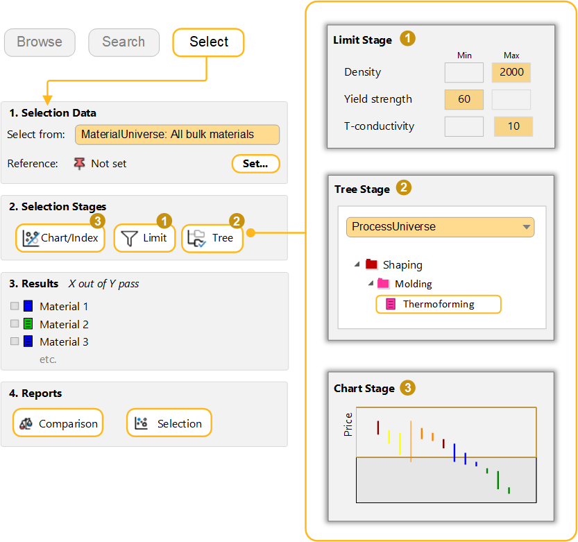 Add a Chart Stage with a bar chart of Price. On the Chart Stage, all materials that fail one or more stages are grayed out. The Results window lists the materials that pass all stages.