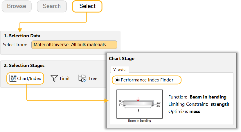 One of the main components of systematic material selection is the use of performance indices. These are combined properties that allow the function of a design to be optimized for a particular application. The Performance Index Finder enables users to quickly identify (and plot) the performance indices that are applicable to their design.