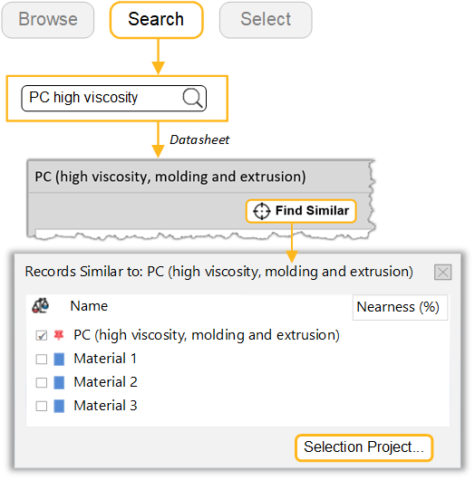 You can find a material using Search, and then use Find Similar to look for other similar records.