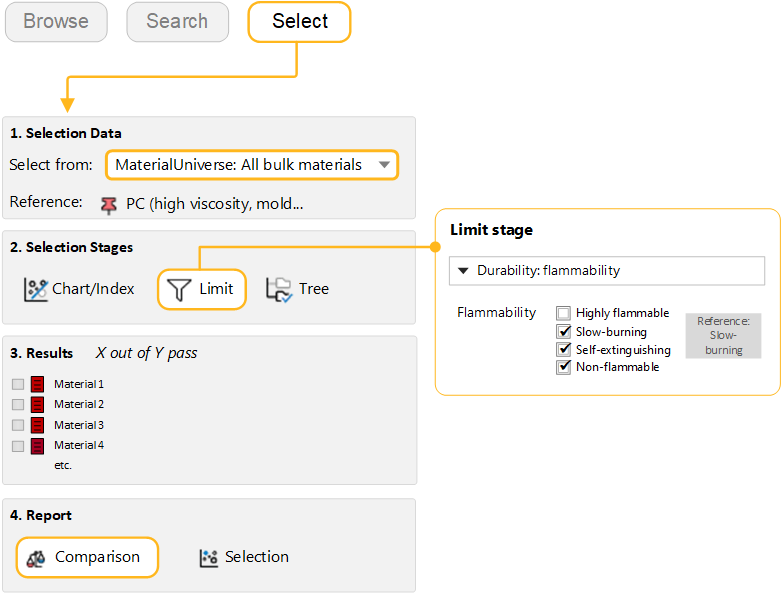 Add a Limit Stage and select materials with equal or poorer flammability than the reference: