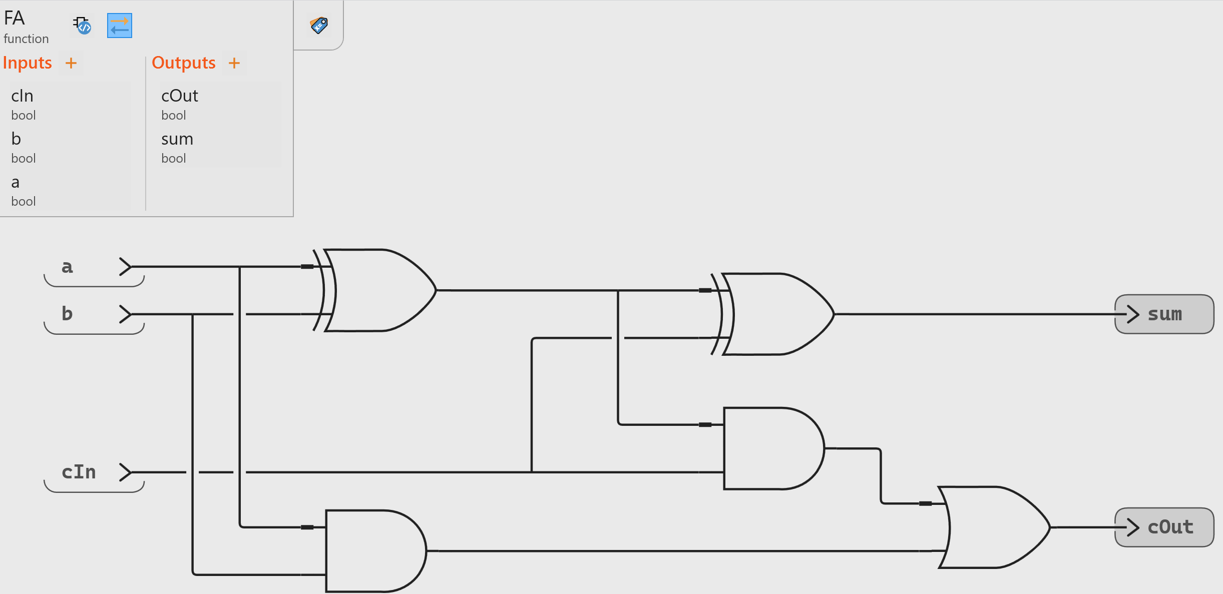 The Swan model of the full adder circuit is composed of the boolean operators XOR, OR, and AND seen previously: