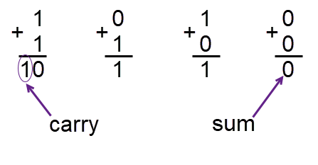 Notice that when you add 0 and 0 or 1 and 0, the result can be represented with just one bit. However, when you add 1 and 1, you require two bits, and one of them serves as the carry.