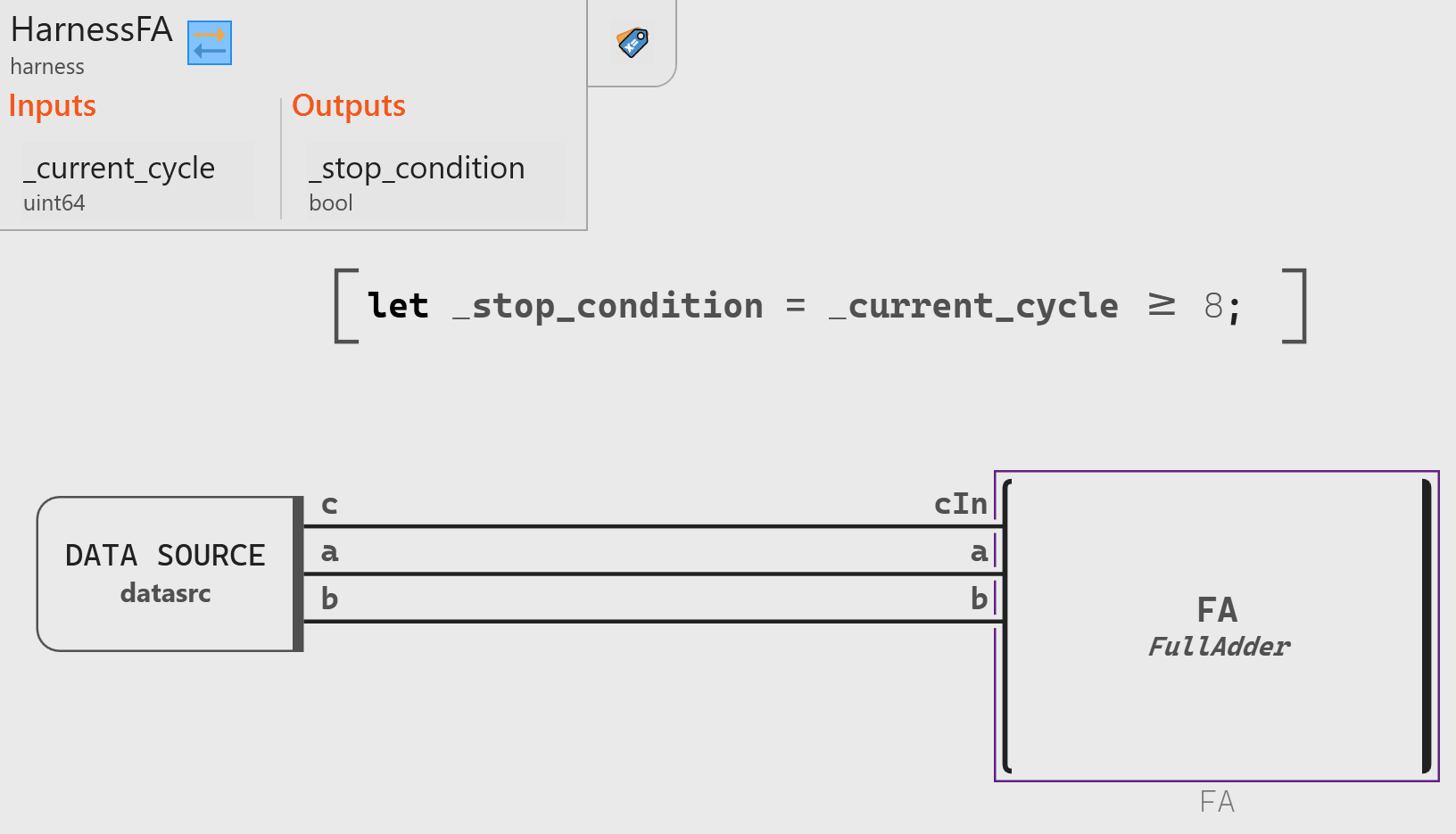 FullAdder::FAfunction behavior, we design a test harness (HarnessFA) in a test module (TestNbitAdder):