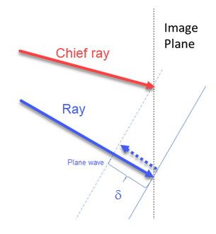「無限」を基準とする場合は、射出瞳がきわめて遠方にあり、光線の角度誤差から厳密な OPD 補正項が得られると仮定します。
