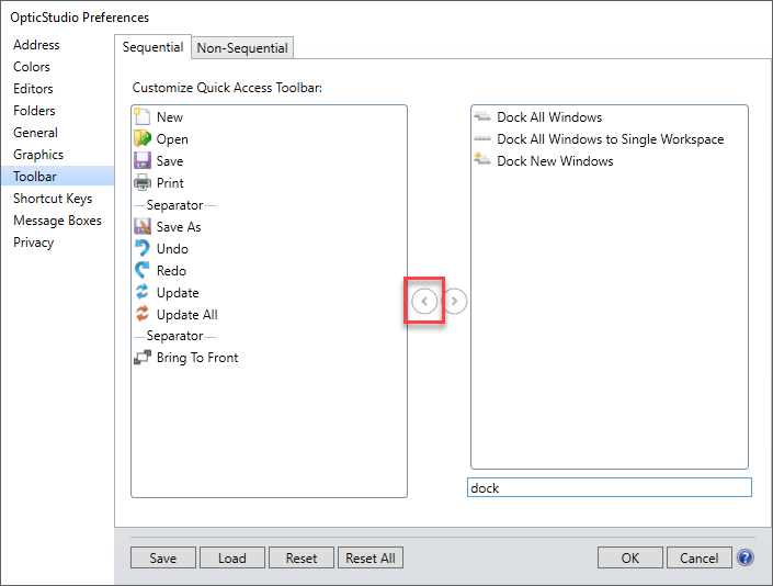 [クイック アクセス ツールバー] (Quick Access Toolbar) に新しいツールを追加するには、まず、[シーケンシャル UI モード] (Sequential UI Mode) タブまたは [ノンシーケンシャル UI モード] (Non-sequential UI Mode) タブを選択し、右側に表示された機能のいずれか 1 つをクリックしてから左矢印をクリックしてその機能をツールバーに移動します。