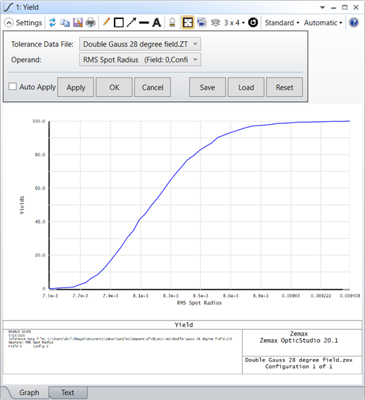 本分析可显示一次蒙特卡罗运行过程中保存的所有数据的累积分布函数或产出曲线。这其中包括所有的公差操作数、补偿器和报告的公差脚本中的操作数。