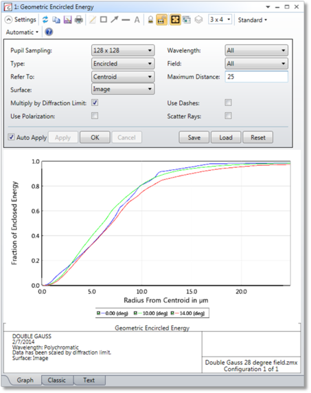 Discussion The X- and Y-only options will compute the fraction of rays which are contained with plus or minus the specified distance from either the chief ray or the image centroid. If a scale of 10 micrometers is shown, then the region enclosed is 20 micrometers across (and infinite in the other direction). The geometric encircled energy is not a good indicator of performance if the system is close to diffraction limited.