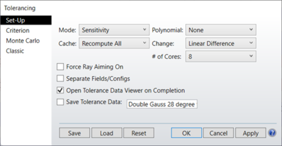 强制开启光线瞄准(Force Ray Aiming On):如果进行公差分析的镜头已经使用了光线瞄准功能,则在评估公差时同样会使用光线瞄准功能。如果镜头中尚未开启光线瞄准功能,那么光线瞄准功能只会在勾选该选项时使用。通常情况下,使用光线瞄准功能会获得更准确的结果,但是这会降低计算速度。对于初步或粗略的公差分析,可以保持默认的"不开启(off)"光线瞄准功能,但是对于最终或精确的公差分析,则需要"开启(on)"光线瞄准功能。