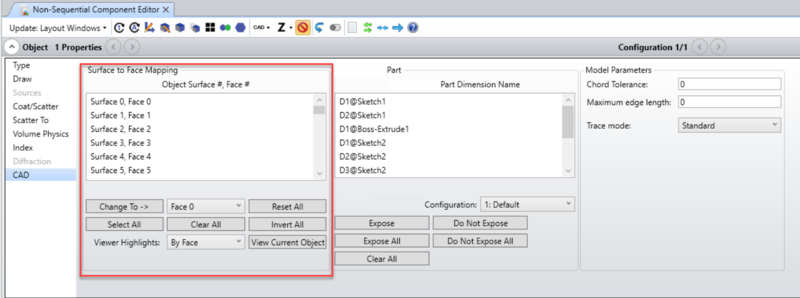 To change how OpticStudio initially determines the number of unique surfaces and sets the default face numbering, see "CAD Part: STEP/IGES/SAT". If the object is a Autodesk Inventor part or Creo Parametric part, this is also where the associated controls are found.