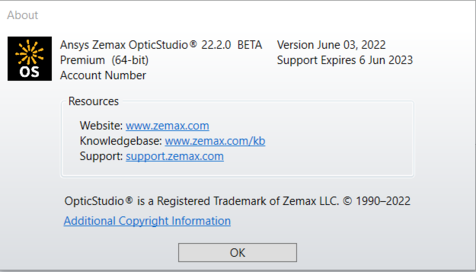 [OpticStudio について] (About) ウィンドウの情報には、ライセンス キーのシリアル番号、ソフトウェア バージョン、サポートの有効期限、および OpticStudio の問い合わせ先情報が含まれます。