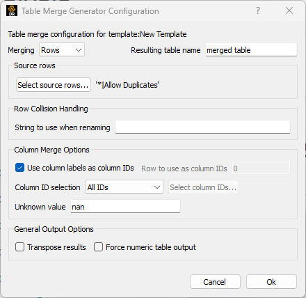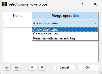 | Select source rows | Opens a dialog, allowing you to define the row selection rules. In the Name column, enter the name of the row(s) to be selected. The name can be the row index (a number), the row label name or a row label name that contains a glob style wildcard. In the Merge operation column, select a merge option that triggers when a row is selected for merging with the same name as an existing row: