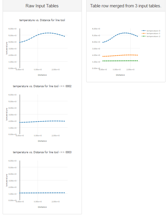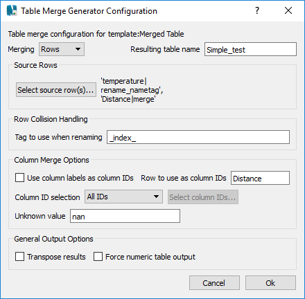 Two sources are selected. All rows with the name temperature are to be merged and they should be renamed by adding the value of the tag to the input row name. In this case the tag is_index_. All the rows with the name Distance are also included and they should be merged into a single row. Assuming each input table has a single temperature and a single Distance row, the output will include three temperature+_index_ named rows and a single Distance row. In the column options, the Distance row has been selected to be used as the column IDs, so the final Distance row has all of the unique values in all three Distance input rows. The implication here is that there will be empty cells in the output table, then the Distance values are not in common between the source tables. In this case, that is ideal as it preserves the desired X vs Y plots and allows for a common X axis named Distance to be used for all of the Y rows.