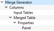 The Table Merge generator takes multiple input data table items and combines them into a single table. The merging process can be customized to select specific rows to merge. The operation has a number of options that make it possible to fold data from multiple data items into individual rows. Unlike many other generators, the merge generator produces a single output table data item every time it is passed a list of input data items. If there are no table data items in the input list, no output table is generated.