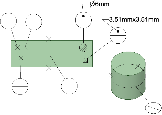 The image below shows the different Datum Targets. From left to right they are, Point, Line, Area (rectangle and Circle), and the three points on the cylinder define a Datum Axis.