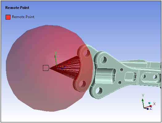 Once you have generated the mesh, the connection lines are drawn between the remote point and the nodes on the corresponding mesh of the underlying geometry. The connection lines take the Pinball radius into account, and only those nodes that are inside that radius will be connected with the remote point. Any remote loads that have been promoted to reference remote points will have these lines drawn when their object is selected as well. An example of connection lines is shown below.