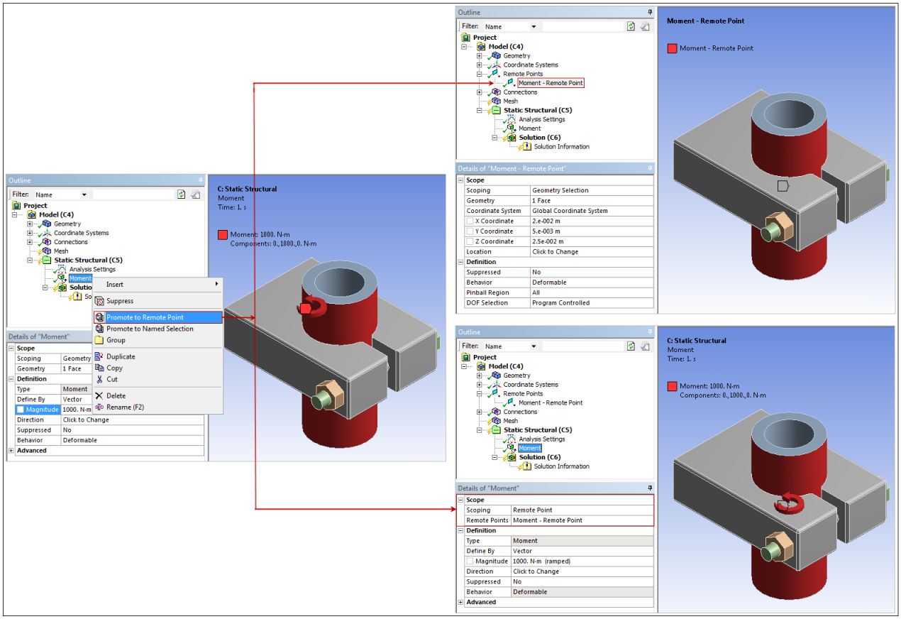 Note: Automatic Remote Point promotion is available in Harmonic Response or Transient Structural analyses that use a linked Modal system to implement the Mode Superposition (MSUP) solver method for the Remote Force and Moment loads. To use this feature:
