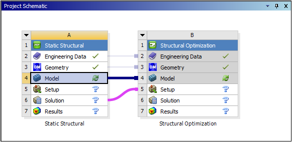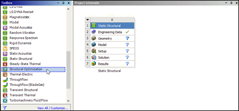 Add a Static Structural analysis to the Project Schematic. Drag and drop a Structural Optimization system onto the static system as shown.
