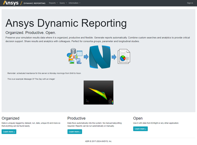 You just started your first Ansys Dynamic Reporting instance. You have successfully started a Nexus server on your machine and connected it to a database. Now you can browse the data that is in this sample database from within your default web browser as shown below.