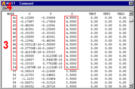 3. Make note of all the node numbers whose Z coordinates are 4.5.