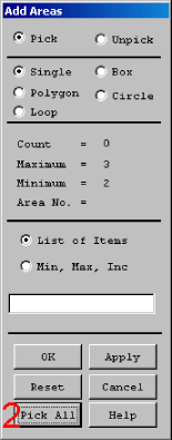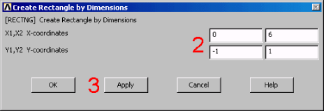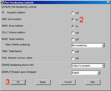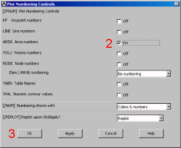 The area plot shows both rectangles, which are areas, in the same color. To more clearly distinguish between areas, turn on area numbers and colors. The "Plot Numbering Controls" dialog box on the Utility Menu controls how items are displayed in the Graphics Window. By default, the program performs a replot upon execution of the dialog box. The replot operation repeats the last plotting operation that occurred (in this case, an area plot).