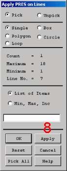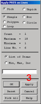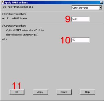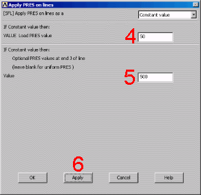 When a circle is created in Mechanical APDL, four lines define the perimeter; therefore, apply the pressure to two lines making up the lower half of the circle. Because the pressure tapers from a maximum value (500 psi) at the bottom of the circle to a minimum value (50 psi) at the sides, apply pressure in two separate steps, with reverse tapering values for each line.