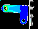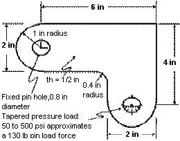 This is a simple, single-load-step, structural static analysis of a corner angle bracket. The upper-left pin hole is constrained (welded) around its entire circumference, and a tapered pressure load is applied to the bottom of the lower-right pin hole. The US Customary system of units is used.