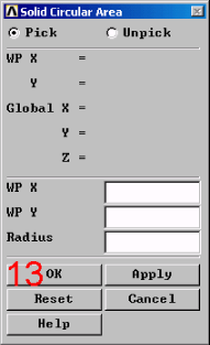 While positioning the cursor for picking, the dynamic WP X and Y values are displayed in the Solid Circular Area dialog.