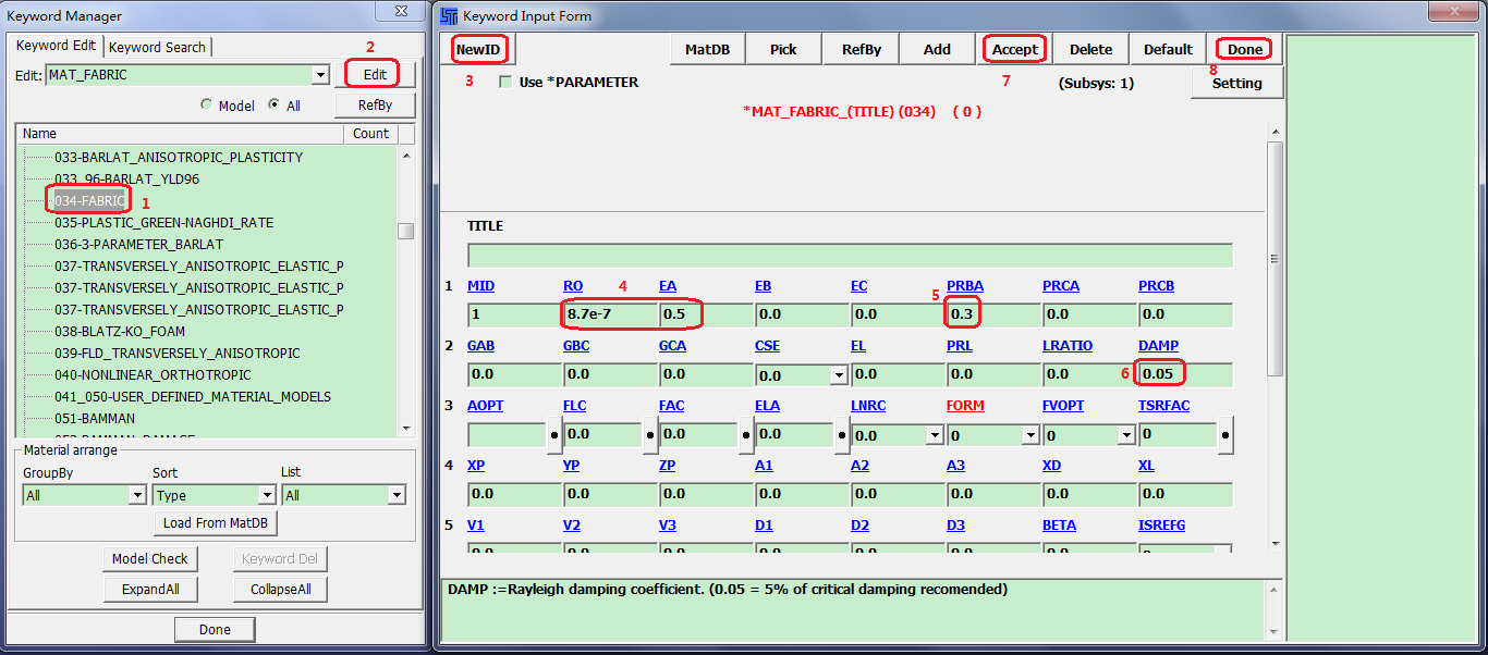 Contents Part III: Model Tutorials | Chapter 2: Create an LS-DYNA Input Deck for a Simple Inflatable Airbag | Print page 2.12. Define MaterialSelect MAT_FABRIC from the Keyword Manager dialog.Select 034-FABRIC.Click Edit.Click NewID in the Keyword Input Form.Enter RO=8.7e-7 and EA=0.5.Enter PRBA=0.3.Enter DAMP=0.05.Click Accept.Click Done. « 2.11. Define Section Properties 2.13. Assign Section Properties and Material »
