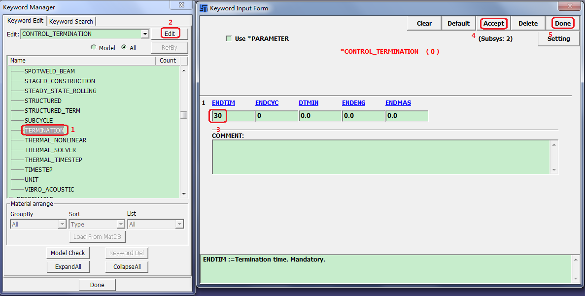 Contents Part III: Model Tutorials | Chapter 2: Create an LS-DYNA Input Deck for a Simple Inflatable Airbag | Print page 2.16. Set Termination TimeChoose FEM > Model and Part > Keyword Manager from the menus.Select CONTROL > TERMINATION from the list.Click Edit.Enter ENDTIM=30 in the KEYWORD INPUT popup form.Click Accept.Click Done. « 2.15. Define Airbag 2.17. Set D3plot Frequency »