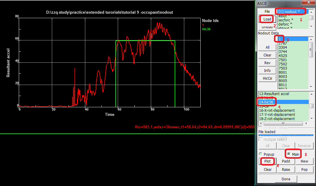 Contents Part IV: Post Tutorials | Chapter 1: Calculate Ooccupant Injury Criterion | Print page 1.3. Generate HIC PlotClick FEM > Post > ASCII.Select nodout * from the top list.Click Load.Select 1 from the middle list.Select 14-hic36 from the bottom list.Click Main.Click Plot. « 1.2. Specify Unit System Settings 1.4. Plot HIC with Pre-filtering »